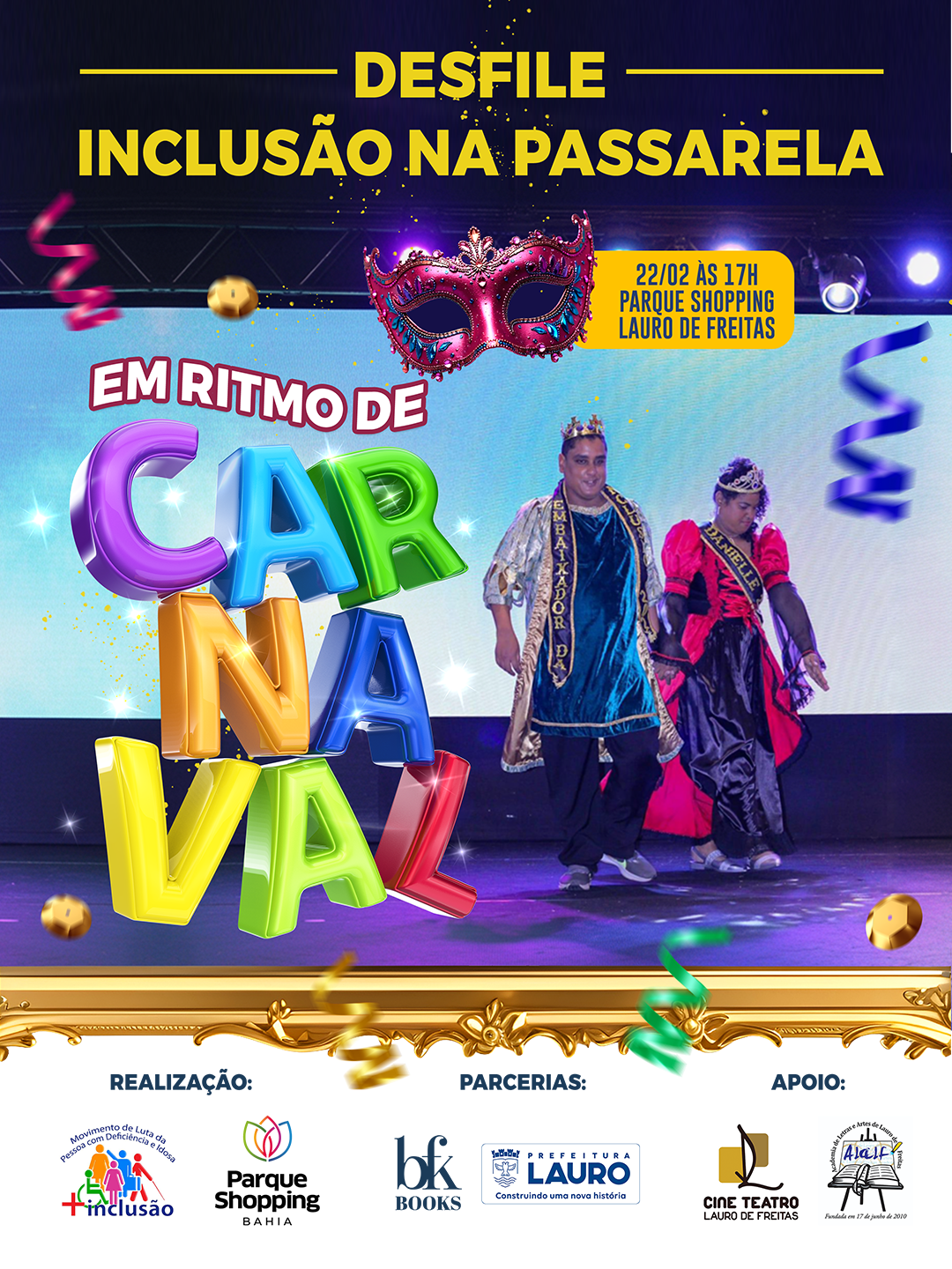 O Movimento de Luta das Pessoas com Deficiência e Idosas de Lauro de Freitas (MLPcDI-LF) atua na promoção da acessibilidade, da igualdade e do respeito, defendendo os direitos das pessoas com deficiência e idosas no município. Com esse propósito, o projeto Desfile Inclusão na Passarela, idealizado por Josy Luz, realiza um desfile inclusivo no Parque Shopping Bahia, contando com importantes apoios, entre eles a Editora BFK Books. A iniciativa reafirma que a inclusão deve estar presente na moda, na arte e na cultura. Com o tema “Em Ritmo de Carnaval”, o evento celebra diversidade, pertencimento e visibilidade, em diálogo com a Lei Brasileira de Inclusão e a Convenção da ONU sobre os Direitos das Pessoas com Deficiência. 22 de fevereiro 17h Parque Shopping Bahia – Lauro de Freitas Saiba mais: @movimentolpcdilf